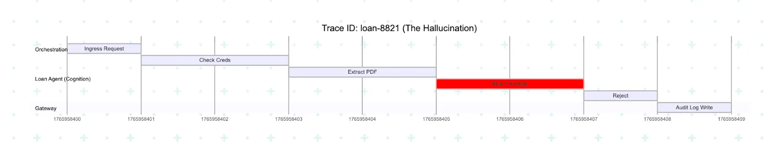 Debugging Without a Recorder: The engineers check the logs. They see the input (application PDF) and the output (Rejection). They check the code—the "Residency Check" function looks fine. They try to reproduce it with a test case, but the stochastic model accepts the test case. They cannot fix what they cannot see.
