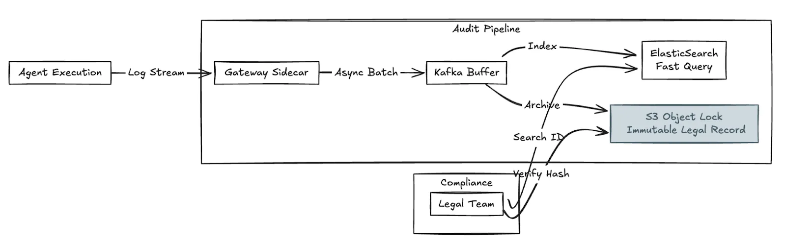 - Storage: The record is pushed to S3 Object Lock (WORM compliance - Write Once, Read Many). This guarantees that even a rogue admin cannot alter the history of an agent's decisions.