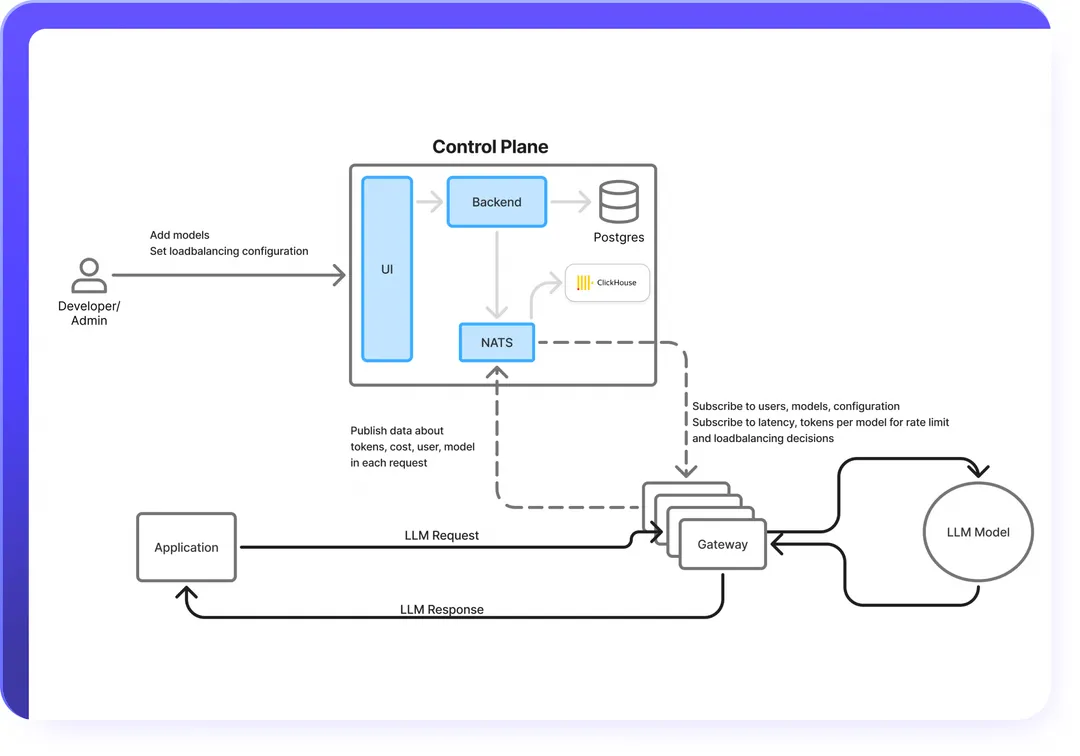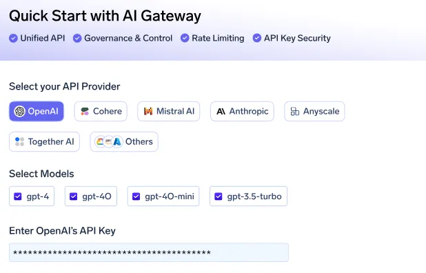 Unified Model Access provides seamless integration with 1000+ LLMs through a single OpenAI-compatible API interface. The gateway supports third-party providers, including OpenAI, Anthropic, Cohere, and cloud platforms, alongside self-hosted and fine-tuned models through one-click "Add to Gateway" functionality. This unified approach eliminates vendor lock-in while enabling organizations to leverage the best models for specific use cases without code changes.
