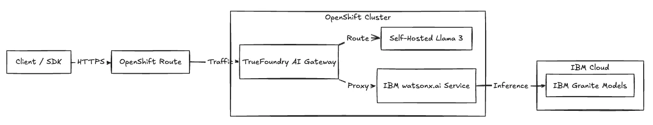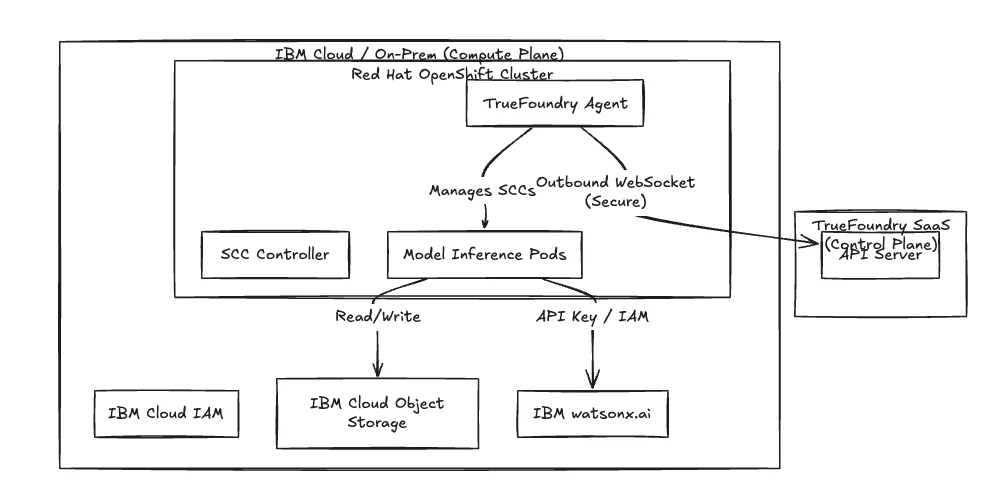 TrueFoundry functions as an orchestration overlay. We decouple the developer experience from the infrastructure complexity, allowing you to deploy LLMs while adhering to the strict boundaries of the Red Hat ecosystem. This post details how we integrate with OpenShift's networking, IBM Cloud IAM, and watsonx.ai.
