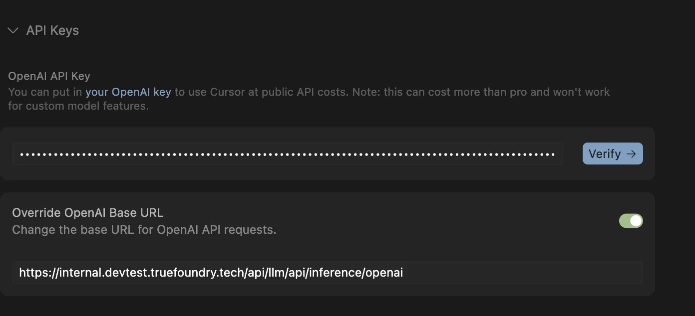 Upon completion of these steps, all LLM requests from the Cursor client will be securely proxied through the TrueFoundry AI Gateway.