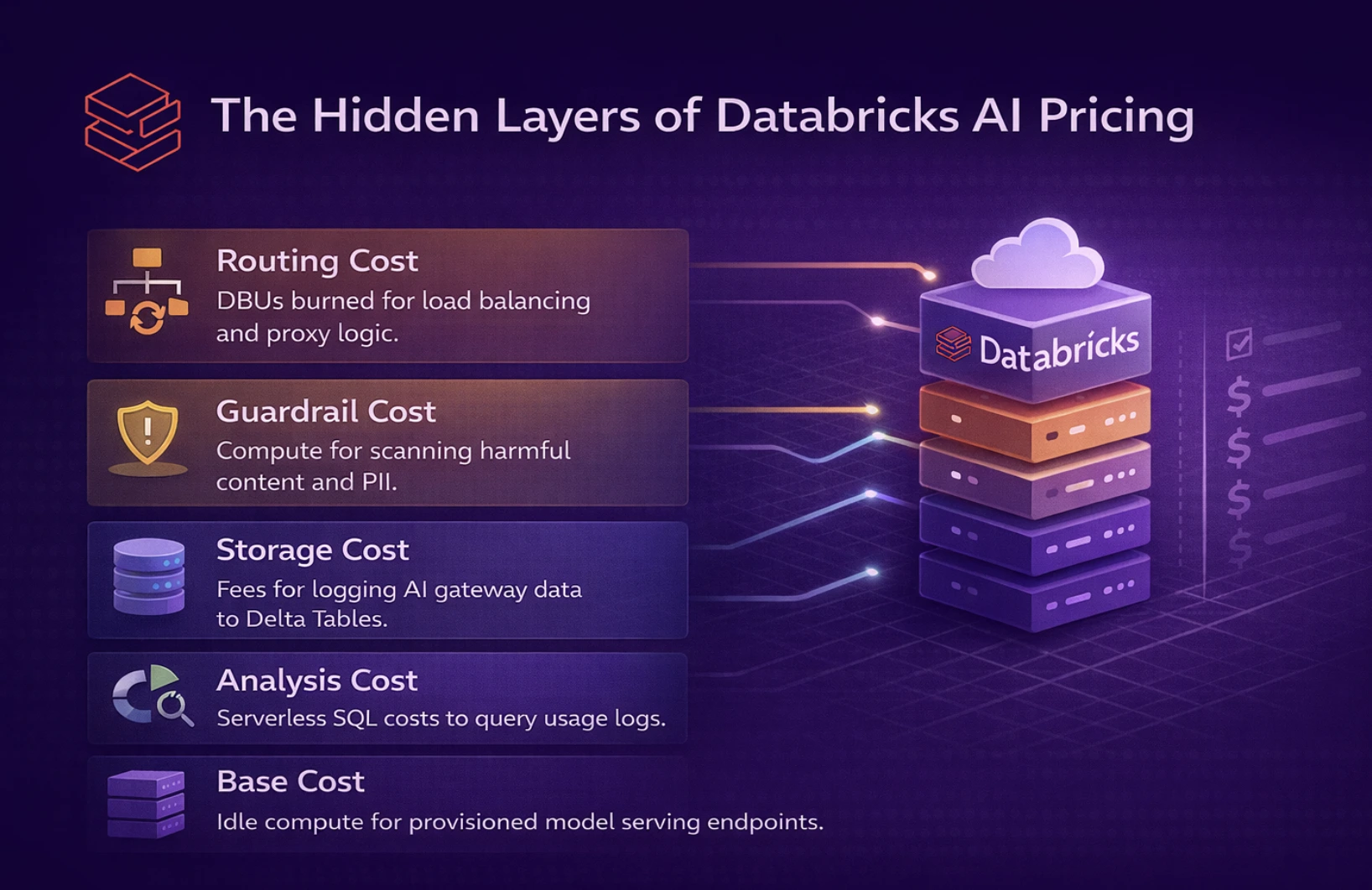 A DBU is a proprietary metric representing processing power per hour. The challenge for platform teams lies in forecasting Databricks AI pricing: a single AI request might involve multiple DBU-consuming events, including gateway routing, guardrail execution, and log ingestion into Delta Tables. DBU costs vary by plan (Standard, Premium, or Enterprise) and cloud provider.