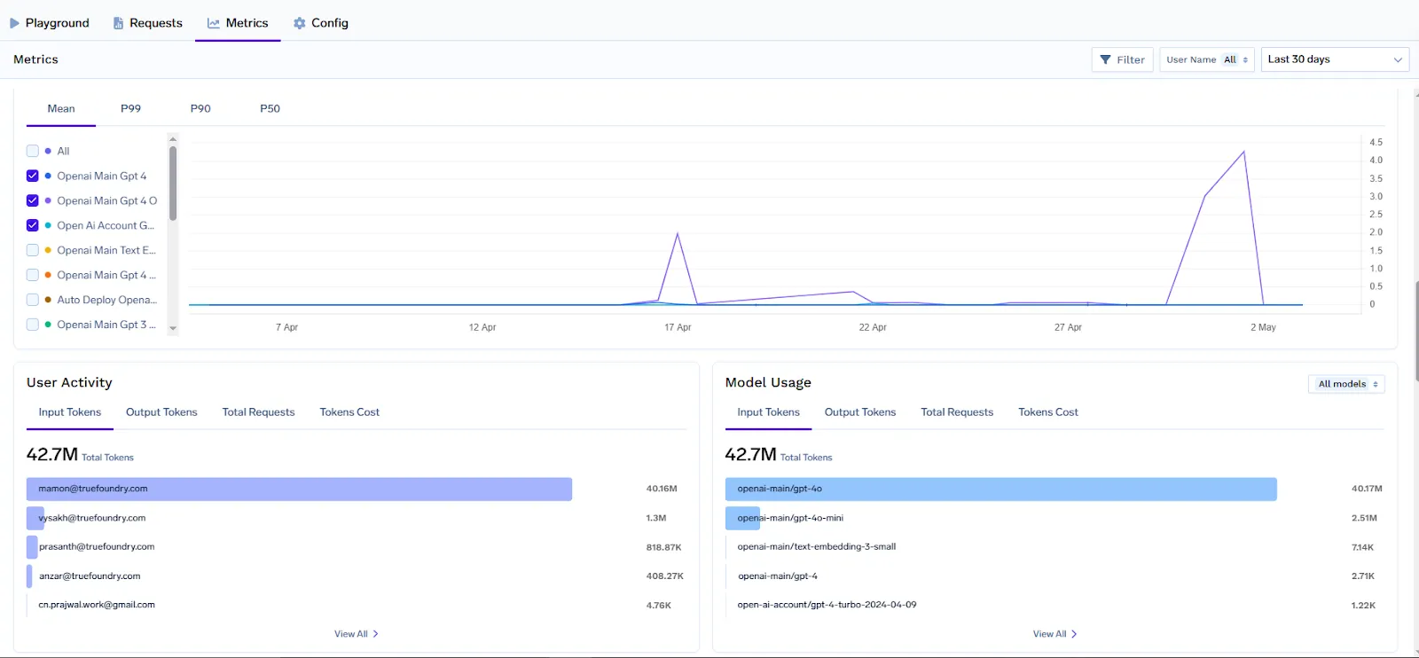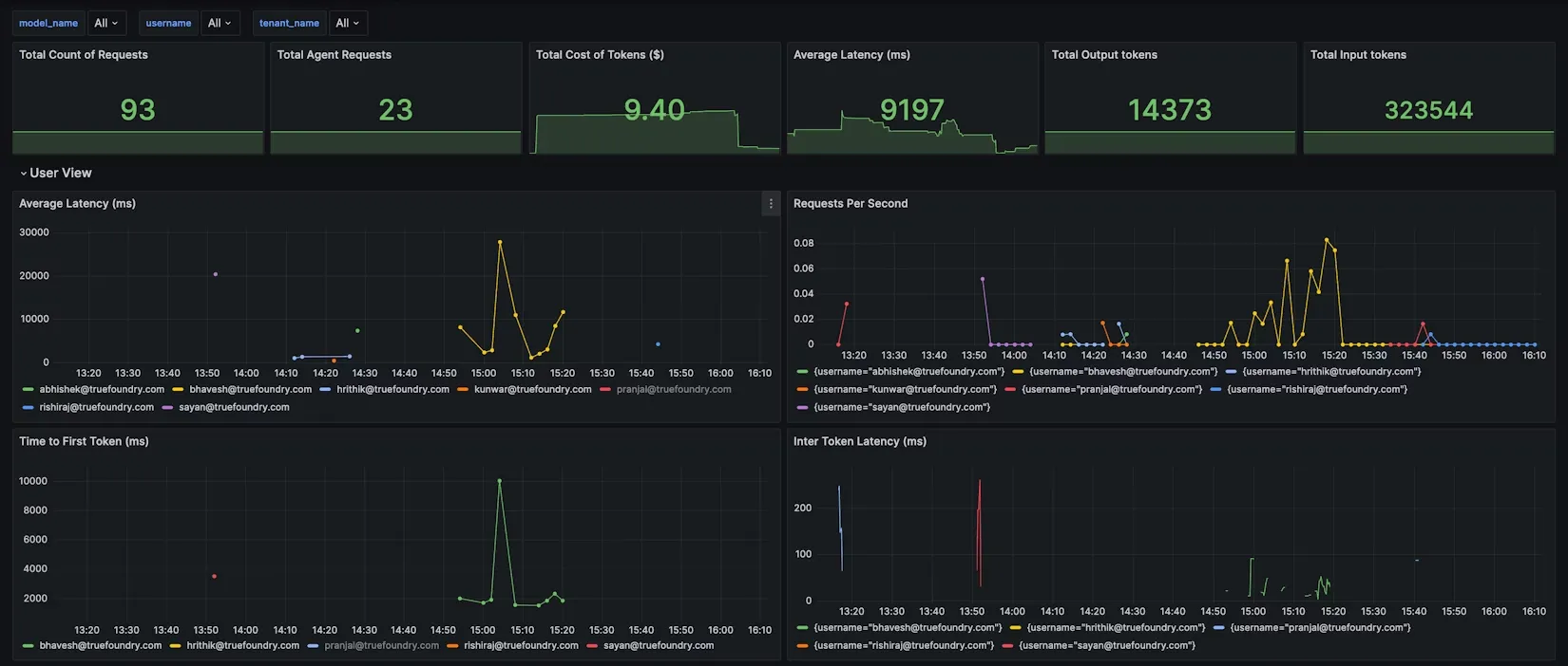 In fact, TrueFoundry provides pre-built Grafana dashboard JSON for AI Gateway metrics, covering views per model, per user, and per configuration rule.