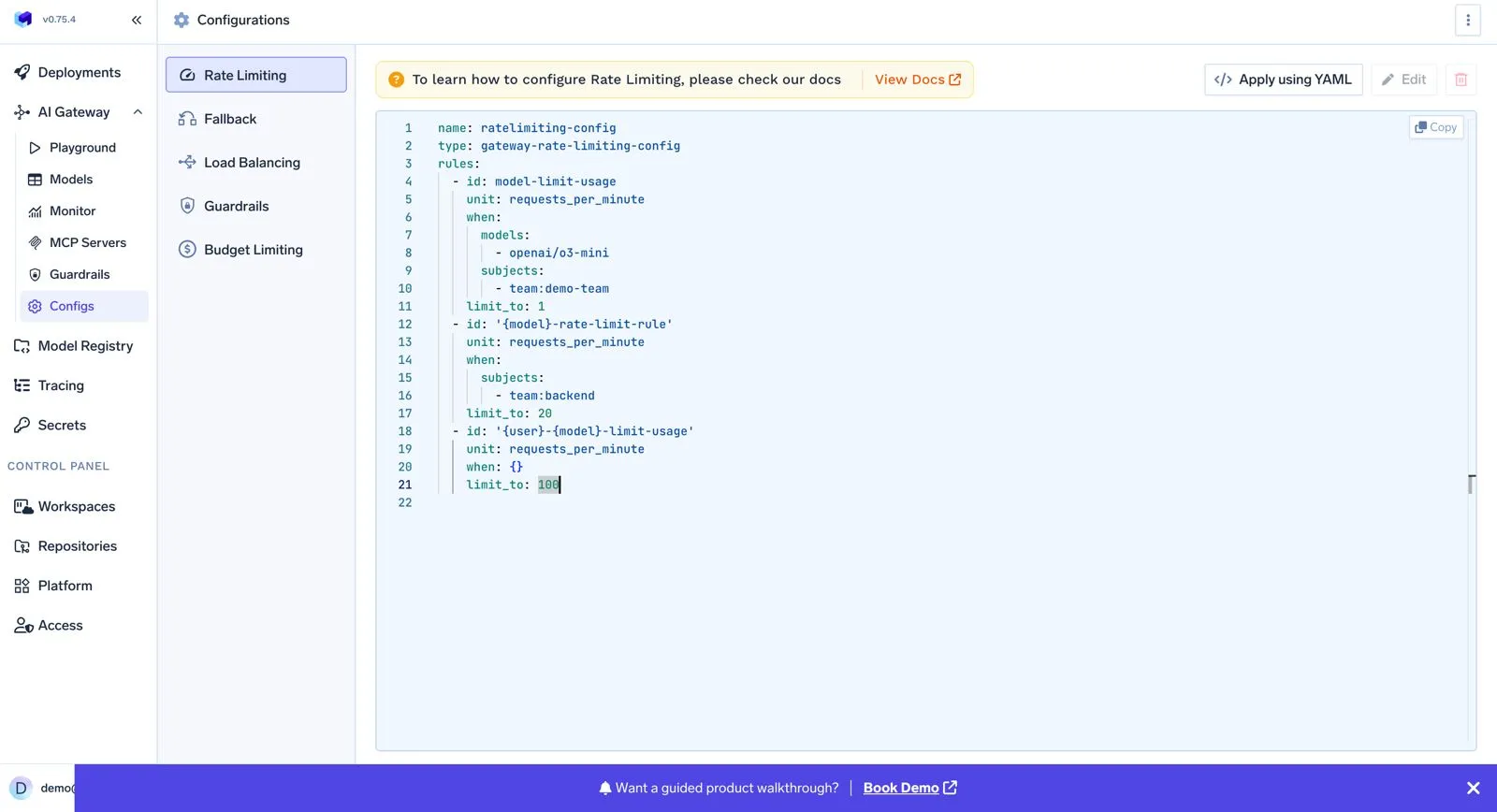 - Supports token- and request-based limits, configurable at user, team, model, or virtual account levels.