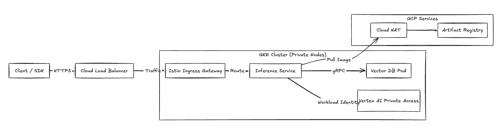 Private Google Access To maintain compliance, traffic to Google APIs (Cloud Storage, Vertex AI) routes via Private Google Access. This keeps traffic between inference pods and GCP managed services on the Google network backbone, bypassing the public internet.