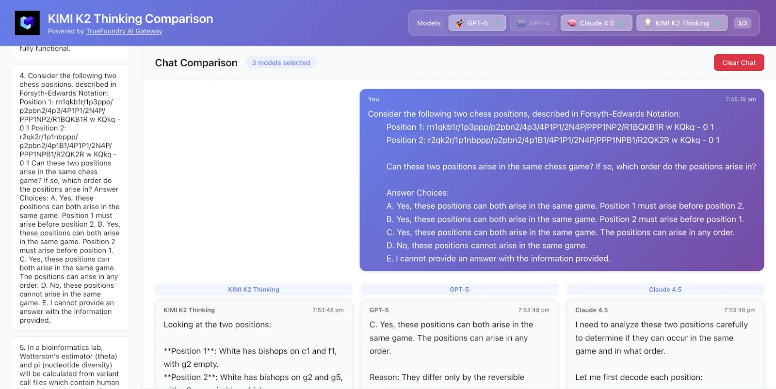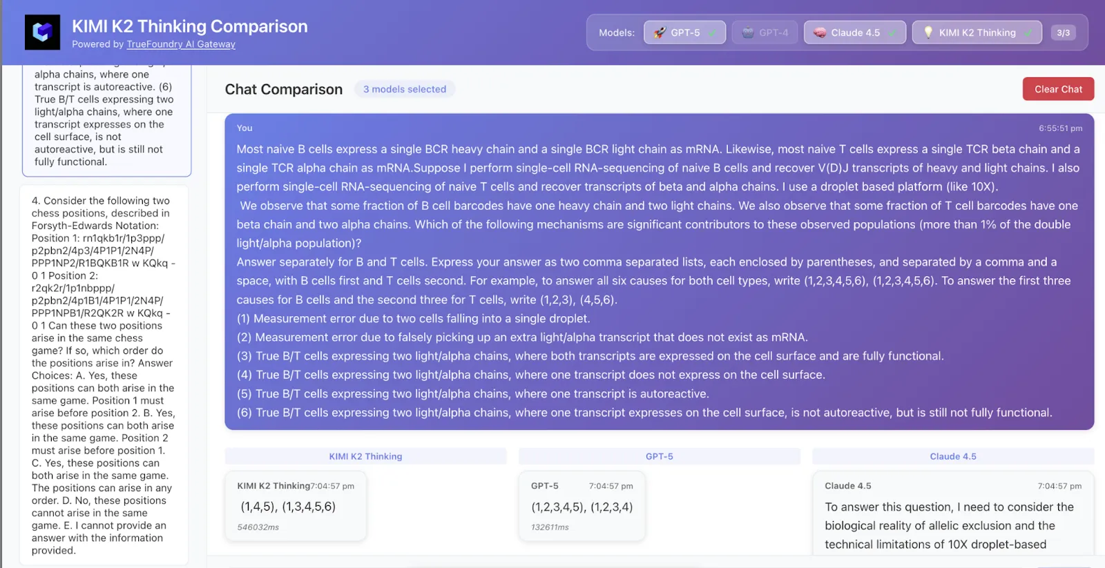 Kimi K2 got both the answer and logic correct while GPT-5 got only the answer correct and Claude was not correct.