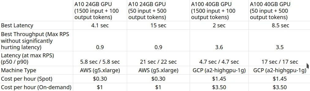 A10 24GB GPU (50 input + 500 output tokens)