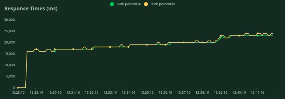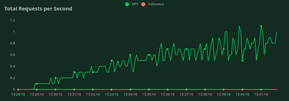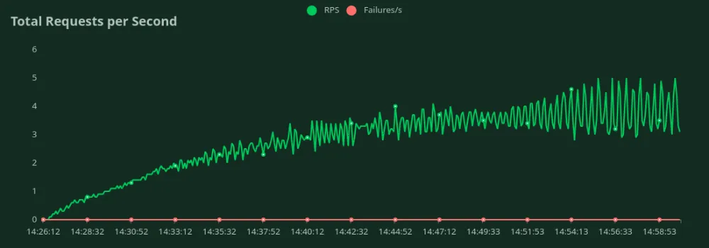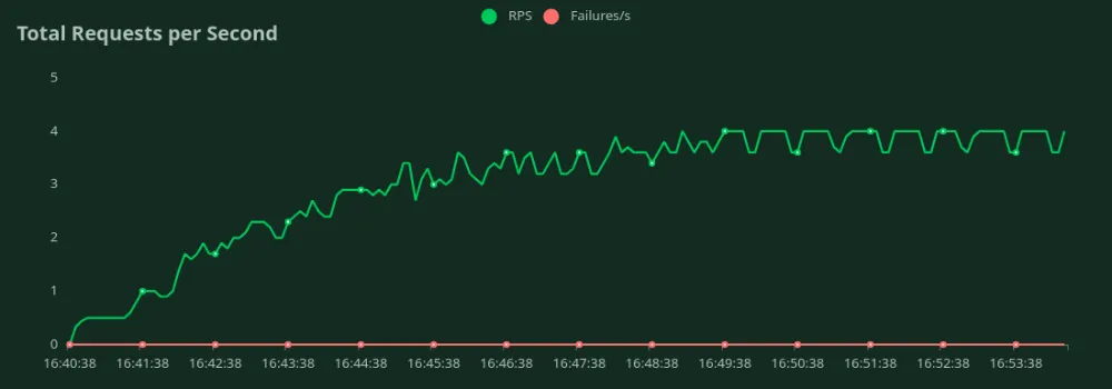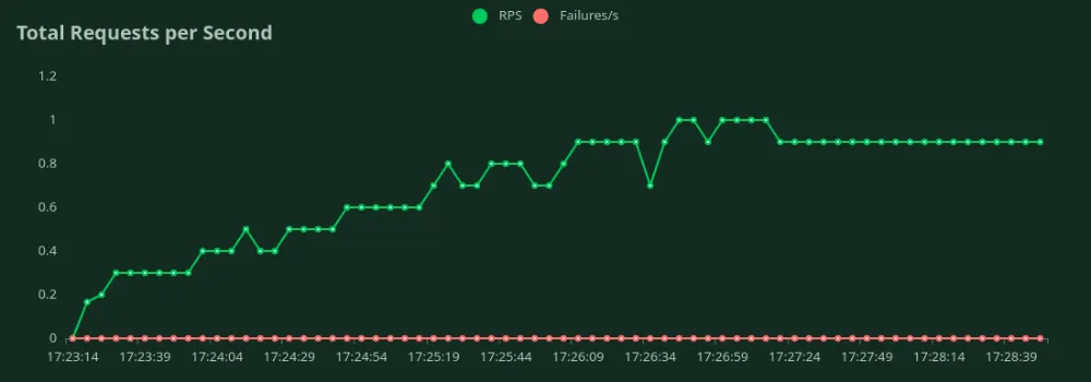In each benchmarking test for a deployment config, we started from 1 user and kept increasing the Number of Users gradually till we saw a steady increase in the RPS. During the test, we also plotted the response times (in ms) and total requests per second.