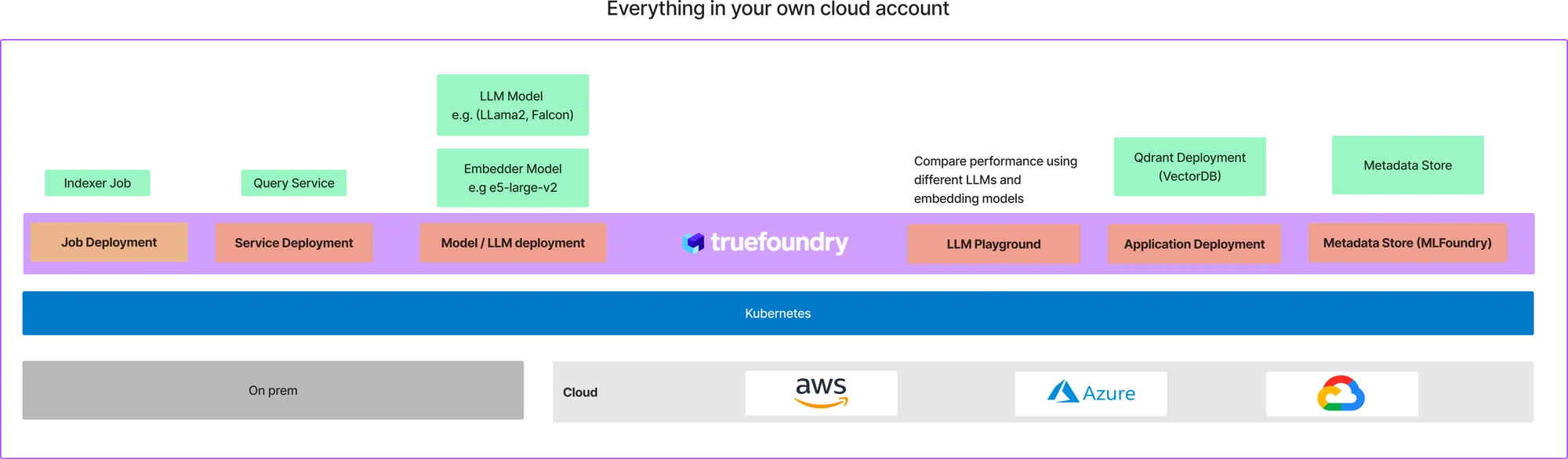 Truefoundry is a platform on Kubernetes that makes it really easy to deploy ML training jobs and services at the most optimal cost. Using Truefoundry, we can deploy all the components in the above architecture - on your own cloud account. The final deployment on your cloud will look something like this: