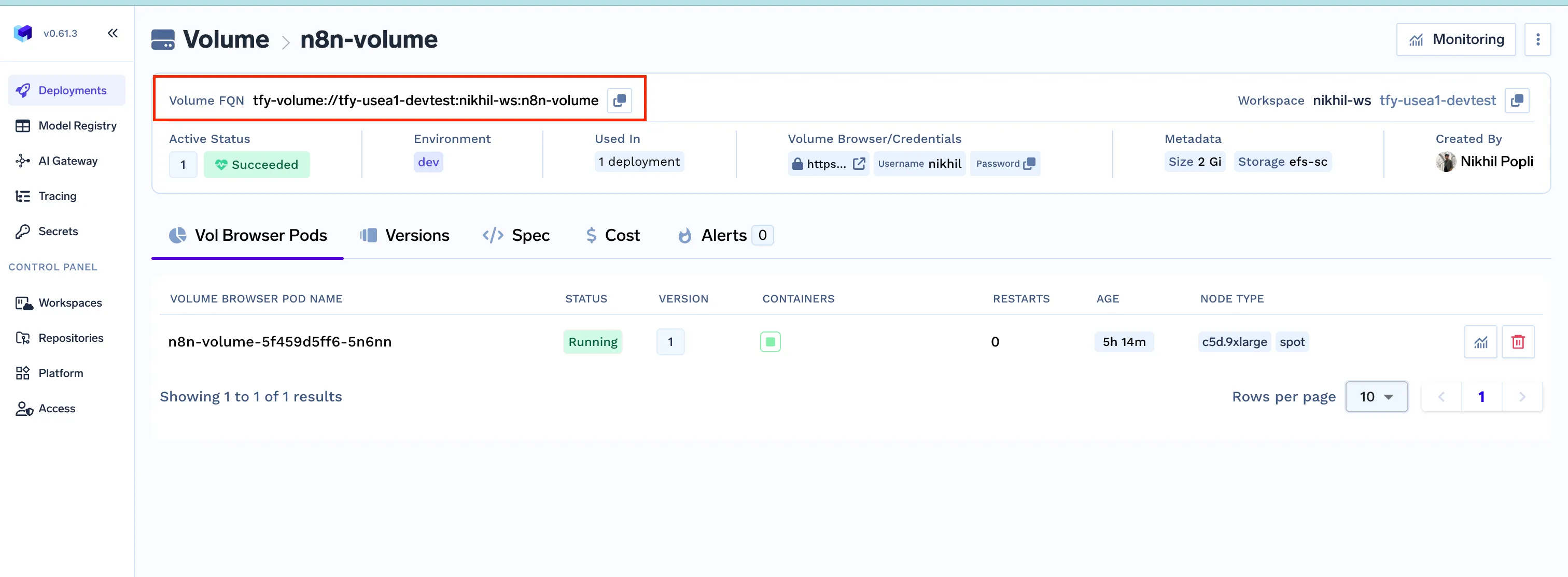 Any n8n self hosted instance requires persistent storage to save your workflows, credentials, and execution data. If the instance restarts, this volume ensures that all your data is safe. You can create this volume using either the TrueFoundry UI or our Python SDK.