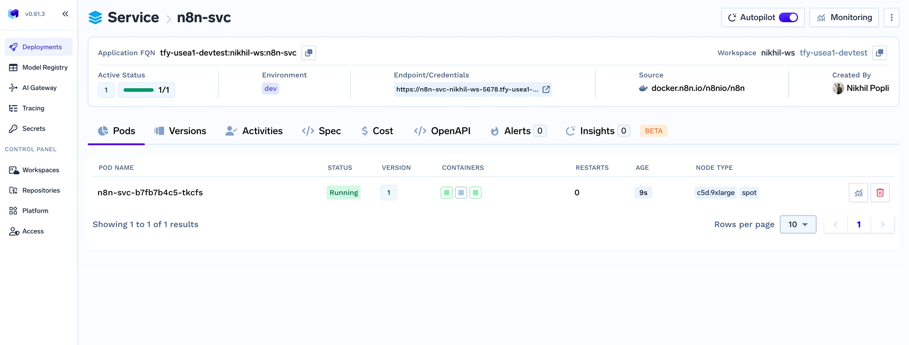 - Workspace: All deployments in TrueFoundry happen within a workspace. Create a new workspace or identify the target workspace you wish to deploy n8n into. You can learn more about workspaces in our key concepts documentation.