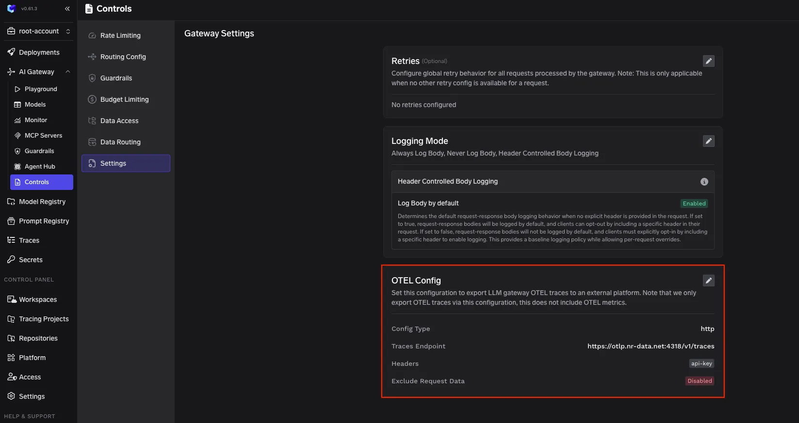 In the TrueFoundry dashboard go to AI Gateway then Controls then Settings. Scroll to the OTEL Config section and edit the exporter configuration.