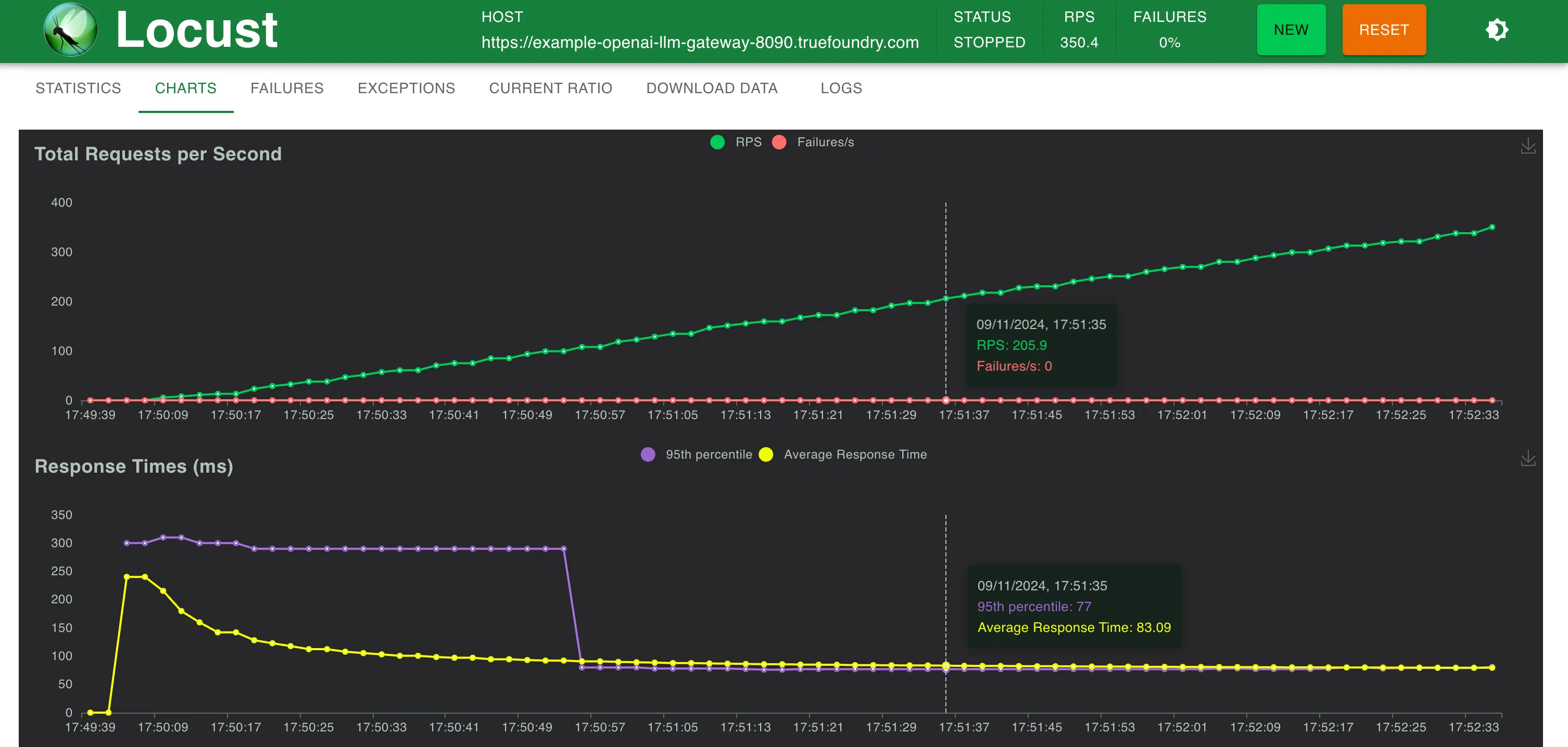 - TrueFoundry LLM Gateway was able to scale without any degradation in performance until about 350 RPS (1 vCPU, 1 GB machine) before the CPU utilisation reached 100% and latencies started getting affected. With more CPU or more replicas, the LLM Gateway can scale to tens of thousands of requests per second.